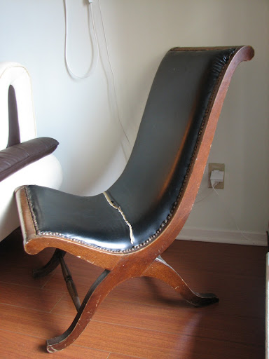 Судя по кожзаму (неровным гвоздикам и складочкам) его уже перетягивали. А что у него сзади? Спинка как сделана? Дерево, дерево с кожзамом сверху или мягкая спинка?