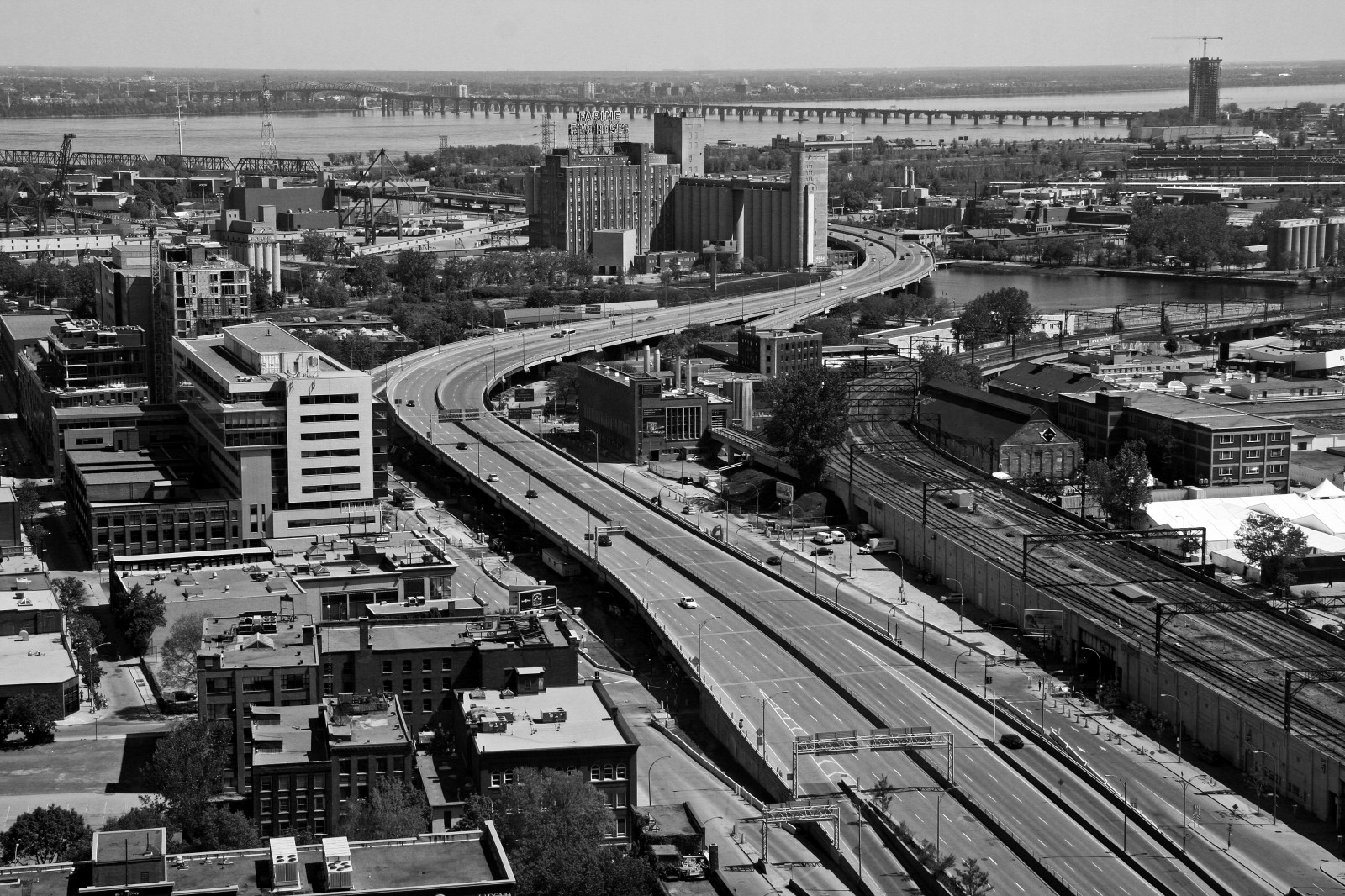 А что такое этот "Bonaventure Expressway"? Это бетонная шестиполосная эстакада в метрах 7-8 от земли. Причем загруженна дорога "не по детски" — через нее каждое утро приезжает огромное количество народа с нашего южного берега. Ну и по вечерам — уезжает обратно. На автобусах и машинах. (Вот тут ее хорошо видно http://projetbonaventure.ca/wp-content/ … 0x1066.jpg ) — там где дорога спускается — въезд в даунтаун. Кстати эта фотка — с сайта, посвещенному этому проекту — http://projetbonaventure.ca