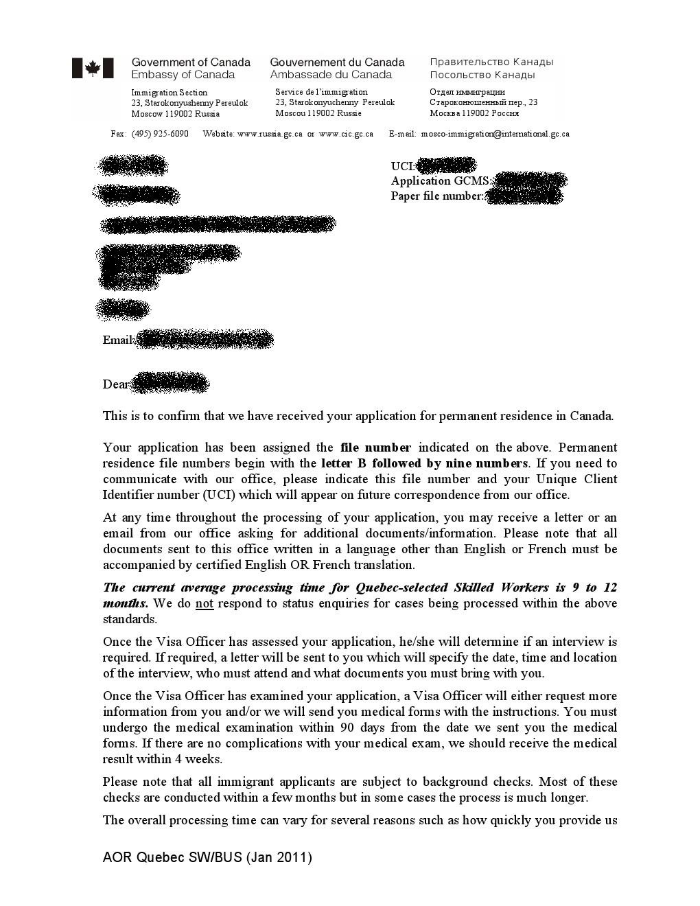 Какие нафиг «трудности перевода»? Вы о чем? Сейчас AOR из посольств приходит с 3 номерами, после введения новой системы учета данных во всех визовых отделах канадских посольств. И МОМ тут не причем совершенно. AOR приходит из посольства. Если интересно как он выглядит зайдите на мой блог и посмотрите статью «Квебек. Картинки с выставки». Я там выложил копии получаемых официальных документов, и AOR в частности.